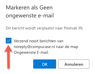- Vink aan "Verzend nooit berichten van noreply@compucase.nl naar de map Ongewenste E-mail." en vervolgens op OK