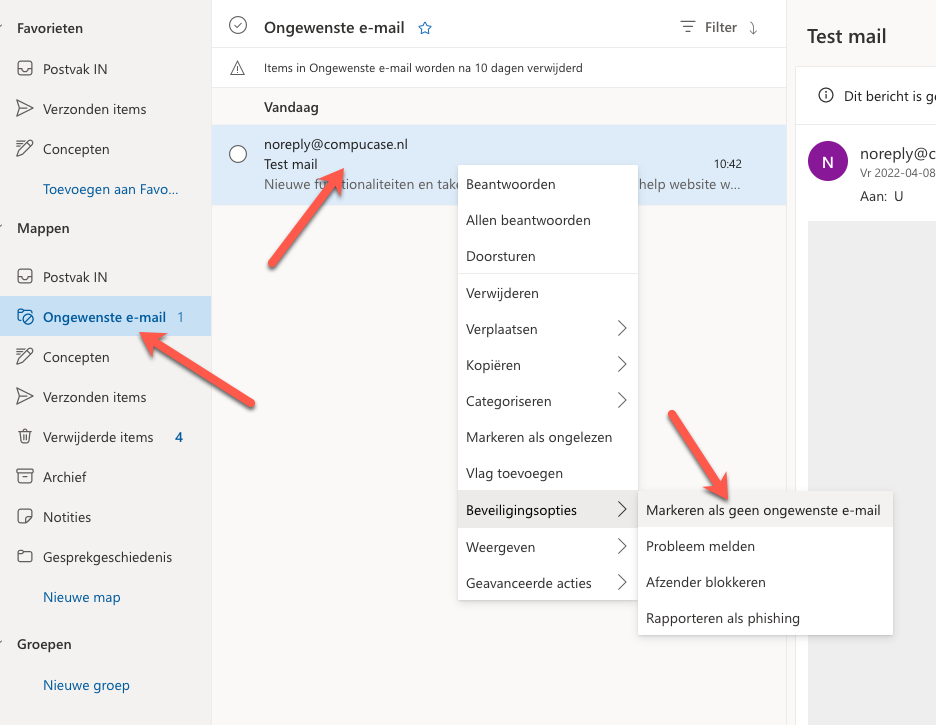 - Klik met de rechtermuisknop op het bericht afkomstig van noreply@compucase.nl